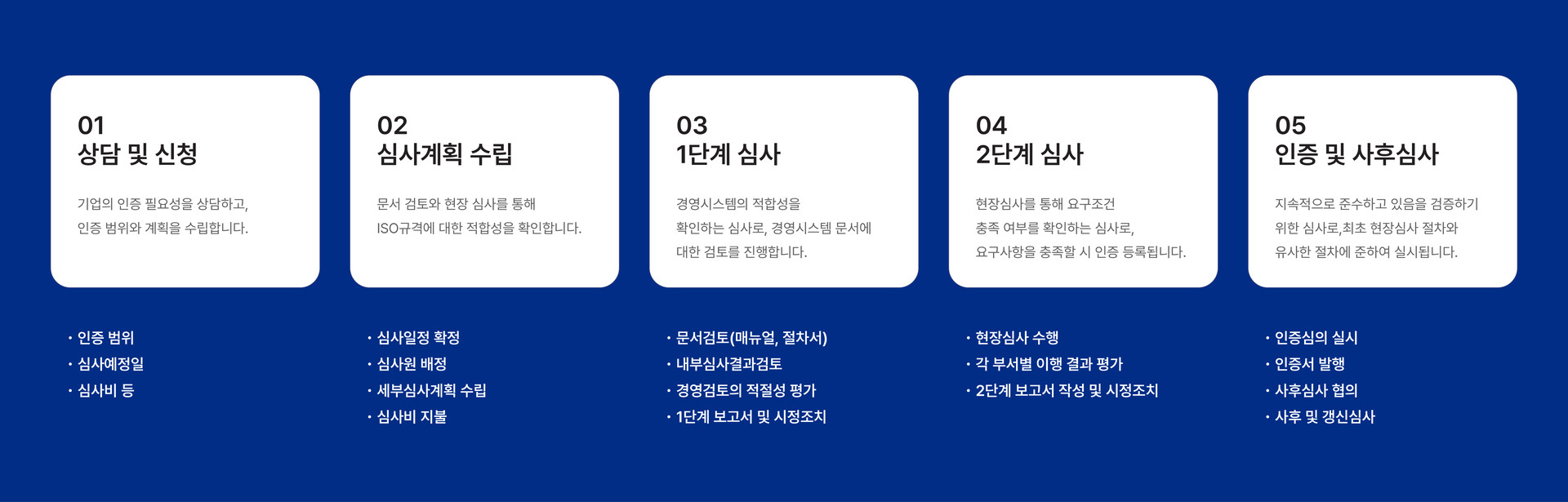 문서 검토와 현장 심사를 통해 ISO 규격에 대한 적합성을 확인합니다.